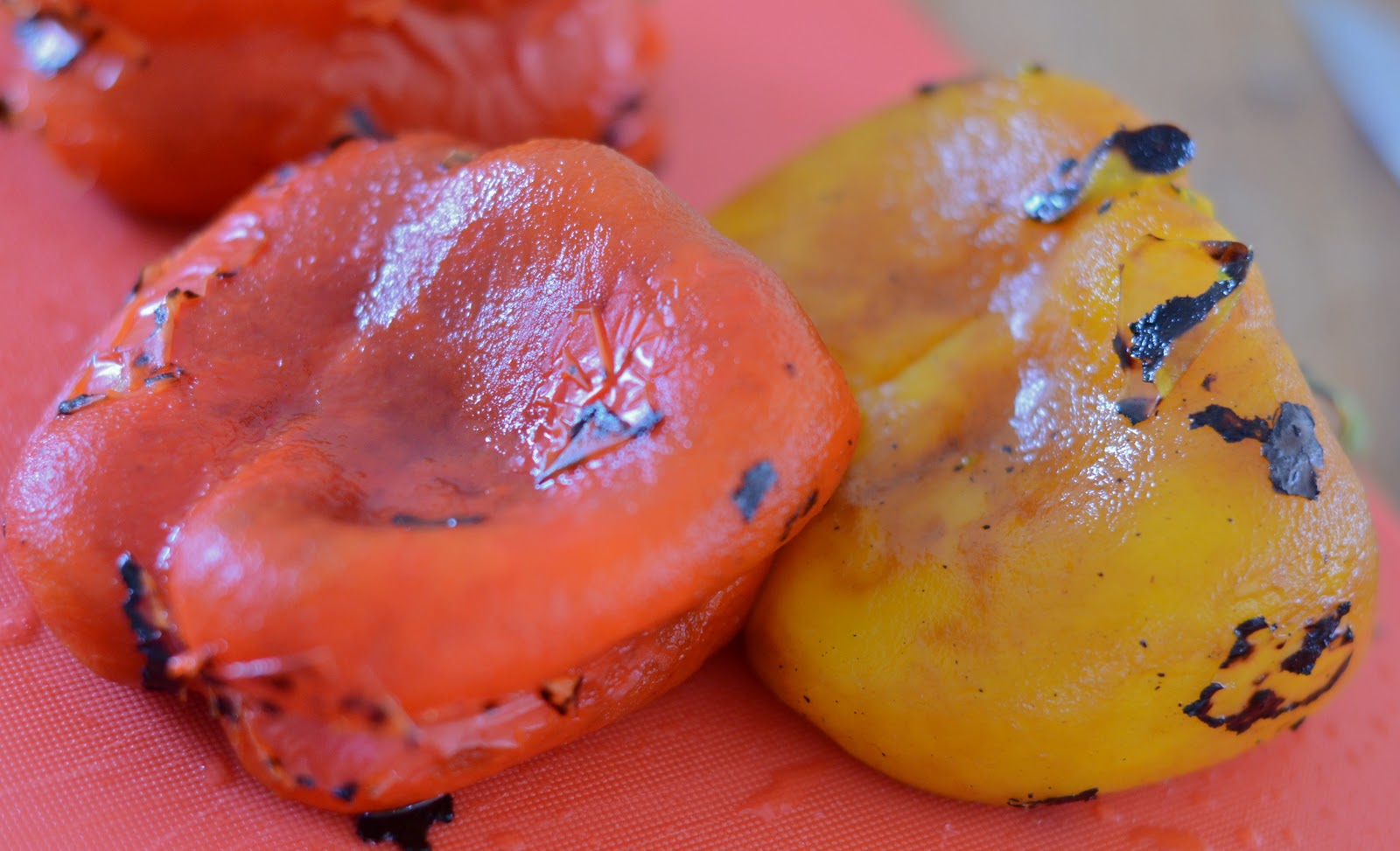 Så tar du 3 paprika (røde og gule) og legger dem under grillen i komfyren til skallet er brent. Har du en gasskomfyr som jeg, kan du ”svi dem av” på blusset. Når de har blitt skikkelig brent har du dem i en plastpose. Etter 10 minutter tar du dem ut, og da kan du fjerne skallet med fingrene. Fjern stilk og kjernene. Nå har du den søteste grønnsak i hånden. Kutt paprikaen i grove biter.