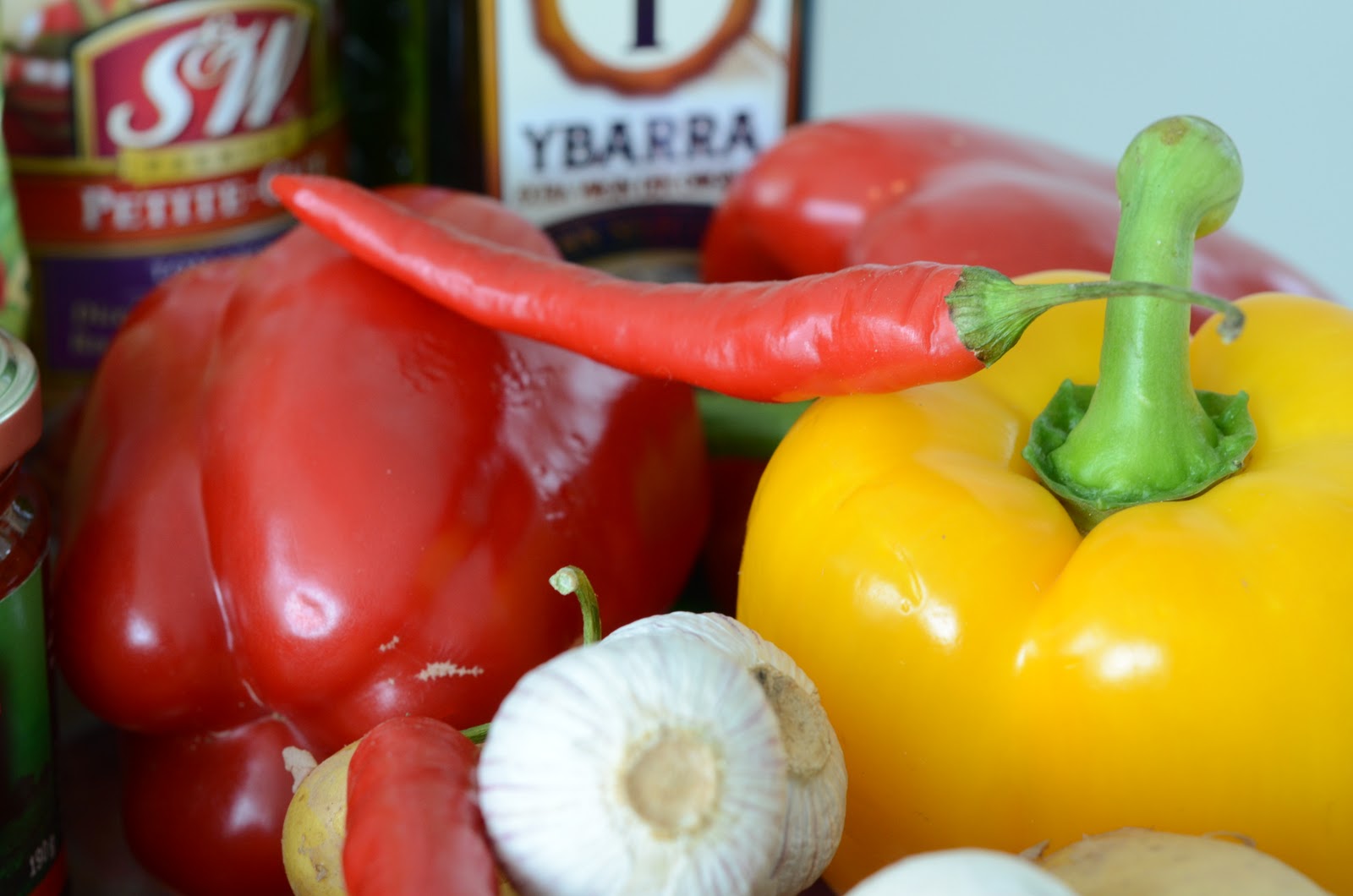 Så tar du 3 paprika (røde og gule) og legger dem under grillen i komfyren til skallet er brent. Har du en gasskomfyr som jeg, kan du ”svi dem av” på blusset. Når de har blitt skikkelig brent har du dem i en plastpose. Etter 10 minutter tar du dem ut, og da kan du fjerne skallet med fingrene. Fjern stilk og kjernene. Nå har du den søteste grønnsak i hånden. Kutt paprikaen i grove biter.